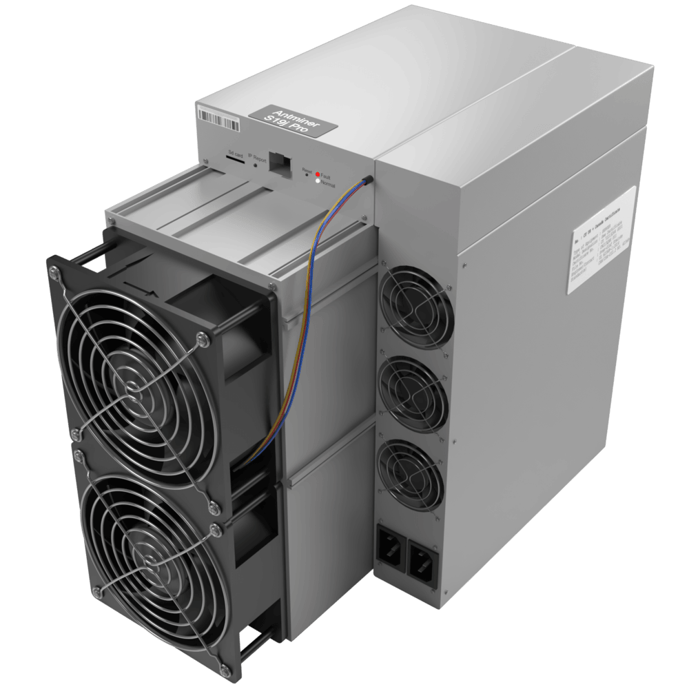 Model Antminer S19j Pro (104Th) from Bitmain mining SHA-256 algorithm with a maximum hashrate of 104Th/s for a power consumption of 3068W.